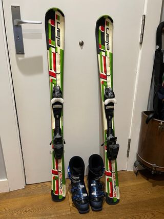 Conjunto de esquís Elan RC Race 120 y botas de esquí para jóvenes esquiadores. - Esquís Elan RC Race 120 con fijaciones. - Botas de esquí azules con cierres. - Diseño deportivo en blanco, verde y rojo.