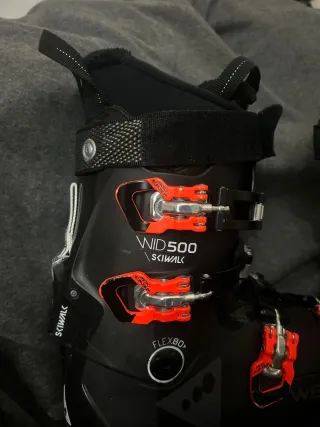 Botas de esquí Wedze WID500 en color negro y detalles en naranja. - Talla 27.0. - Cierre con 4 ganchos. - Correa de velcro en la parte superior. - Diseño ergonómico.