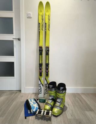 Conjunto completo de esquí de travesía. - Esquís Fischer Tour amarillos. - Botas de esquí Scarpa amarillas. - Cuchillas para esquí. - Bolsa de transporte azul con estampado Esquís físcher tour Aircarbon 175cm Fijaciones Silvrrtta puré carbon. Con cuchillas Pieles de foca a medida y encoladas. Botas Scarpa F1, casi nuevas. Talla 44 (29cm) 318 carcasa Equipo ideal para iniciarse Fijación polivalente travesía y alpino. Encerados y listos para usar.
