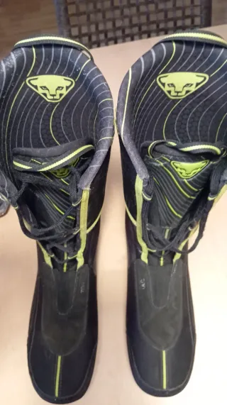 Botas de esquí de montaña Dynafit. 328mm equivalente 45,5, 46 horma estrecha. - Color verde y amarillo. - Cierre con hebillas y velcro. - Interior con diseño de rayas negras y verdes. Lengüetas dura y blanda