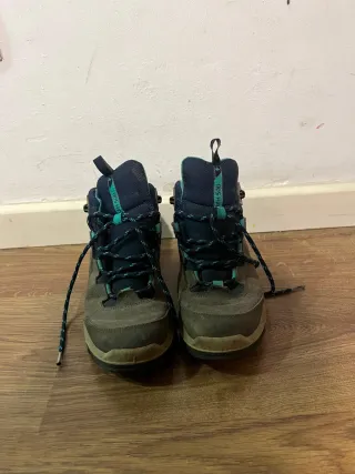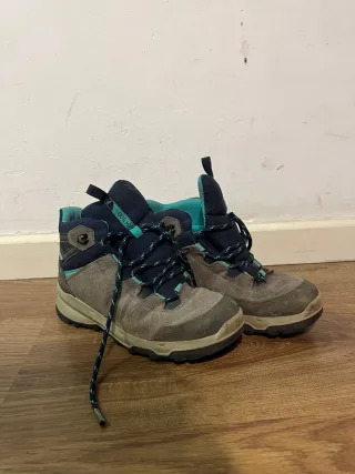 Botas de montaña para niñ@ de Decathlon, ideales para senderismo y actividades al aire libre. - Material exterior de nylon resistente. - Membrana Gore-Tex para impermeabilidad y transpirabilidad. - Suela de goma para un buen agarre. - Cierre con cordones. - Caña alta para mayor sujeción del tobillo. Han sido utilizadas en 2 ocasiones,están en un estado impecable.