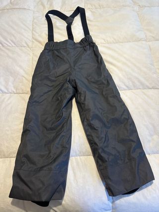 Pantalones de esquí para niño en talla 5 años marca Decathlon Wedze. Impermeables, cómodos y prácticos para la nieve. - Tirantes ajustables. - Tejido resistente al agua y al viento. - Color gris oscuro - Gomas para pasar debajo de la bota