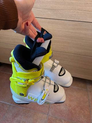 Botas de esquí para niños de la marca Wedze, Decathlon. - Talla 26/29 (16,5cm a 18,5cm) - Color blanco y amarillo. - Cierres de hebilla (2 hebillas) - También se puede hinchar la caña de la bota con unos botones que lleva en la parte de atrás para mayor comodidad y sujeción de la bota a la caña de la pierna. Están perfectas, poco uso y muy cuidadas. En perfectas condiciones para usar como si fueran recién compradas. Vendo porque se le han quedado pequeñas. Recogida en Puzol (Valencia) pero también puedo enviarlas.