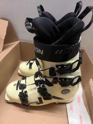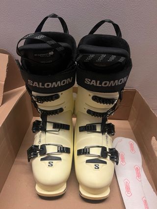 Como nuevas, en su caja. 3 días de uso. Botas de esquí Salomon Shift Pro 110 para mujer de freeride. Se pueden probar en Formigal. - Modelo: Shift Pro 110 - Marca: Salomon - Color: amarillo-beige - Cierre: Hebillas y velcro - Incluye plantillas BIAGIOLI