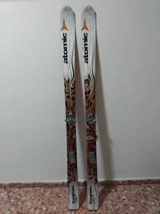 Equipo de esquís de travesía Atomic con un diseño llamativo. - Marca: Atomic - Modelo: Freeride - Diseño con motivos tribales y flameados en tonos blancos, dorados y negros. - Fijaciones incluidas. - botas del 44. La bota del pie izquierdo le falta la suela de interior se despegó pero apenas se nota. Con una plantilla o sin ella va bien. - juego de pieles de foca y cuchillas todo en perfecto estado . Si puede ser se ENTREGA EN PERSONA .