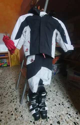 Completo conjunto de esquí para disfrutar de la nieve. Incluye chaqueta, pantalón, botas y guantes (ver fotos) - Chaqueta y pantalón de esquí con diseño en blanco y negro talla 95-110 cm - Botas de esquí Tecnica negras con cierres de hebilla. - Guantes de esquí rojos con velcro grande para mas facilidad al poner y sacar MAS ROPA EN MI PERFIL