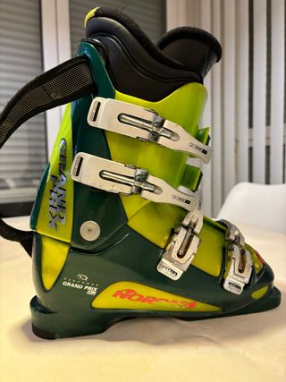 Botas de esquí Nordica Grand Prix en talla 25–25.5 (295 mm), color verde. Equivalen aproximadamente a una talla 39–40 de zapatos normales. Cierre con 4 ganchos metálicos + correa de velcro superior. Usadas únicamente un fin de semana, por lo que están en perfecto estado, tanto el exterior como los forros interiores. Ideales para esquiadores que buscan comodidad, buen ajuste y precisión en pista. Las vendo porque no son mi talla real. Posibilidad de ver y probar sin compromiso.