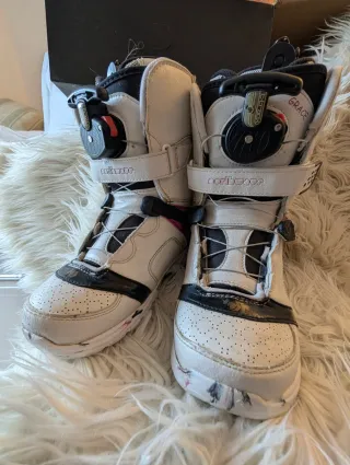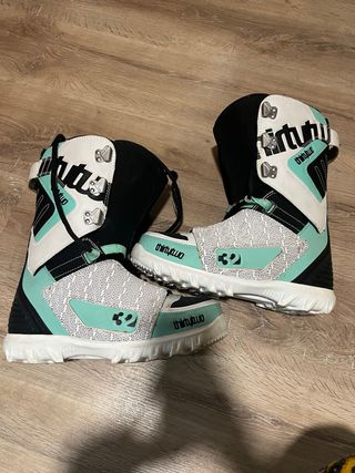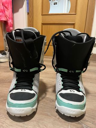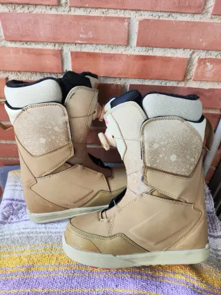 Botas de snowboard ThirtyTwo, diseño espectacular de Volcom. Número 38.5 EU (5.5 UK, 7.5 USA) Las más cómodas que he probado jamás, y las más bonitas que he tenido 😢. Las vendo con muchísima pena tras usarlas SOLO DOS DÍAS porque me quedan demasiado grandes y ya no las puedo devolver. Puedes comprobar que están IMPECABLES, si las meto en la caja original y te digo que están sin usar, te lo crees. Pagué por ellas 340€ y te las doy por 240€ 😭 - La suela se moldea sola con el calor corporal. No tuvieron tiempo de hacerse al mío, se amoldarán a tu pie para un ajuste perfecto. - Pads extra de ajuste tobillos -2 sets cordones regalo