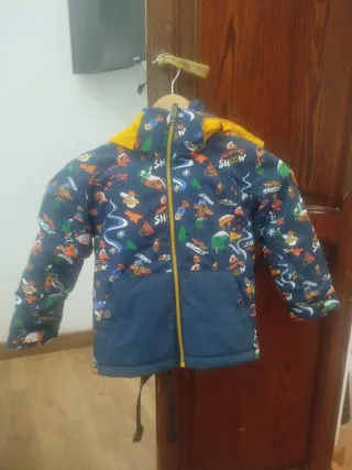 Conjunto de chaqueta y pantalón de esquí Quiksilver talla 3, perfecto estado, solo dos usos. Chaqueta y pantalón a conjunto comprados en Andorra de dinosaurios. Botas talla 28 quechua y camiseta térmica negra de regalo. Mi hijo lo ha gastado dos años, el primero le venía un poco grande y el segundo bien. - Diseño estampado. - Capucha. - Cremallera frontal. - Bolsillo interior - Impermeable