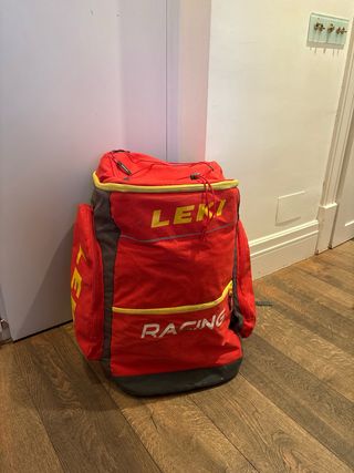 Mochila de esquí Leki modelo Racing. - Color rojo con detalles en amarillo y gris. - Bastante usada pero bien conservada (algunas letras desgastadas, ver foto). - Bastante grande. Te cabe todo el equipo de esqui dentro!