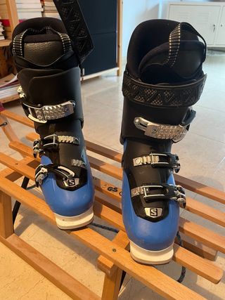 Botas de esquí de la marca Salomon en color azul. - Cierre con 4 ganchos. - Hebillas ajustables. - Interior forrado. - Talla 24.5 ( equival a un 38 )