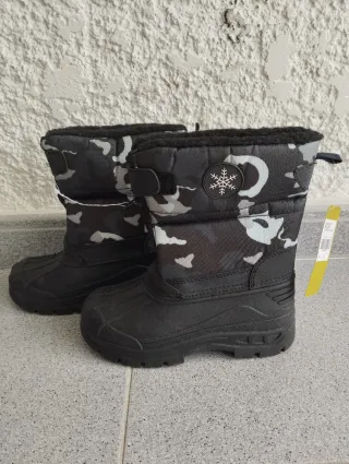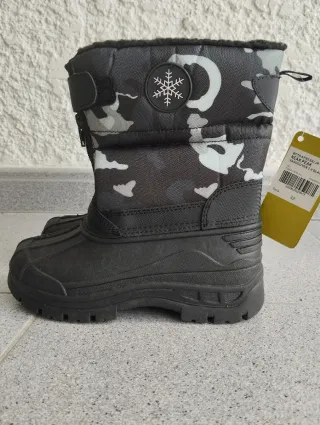 Botas de nieve impermeables para junior con un diseño de camuflaje moderno y forro interior cálido. - Talla 32 - Diseño de camuflaje en tonos grises y blancos. - Cierre de cremallera y velcro para un ajuste fácil. - Suela de goma antideslizante. - Forro interior de pelo sintético para mayor calidez.