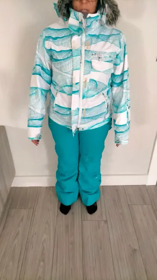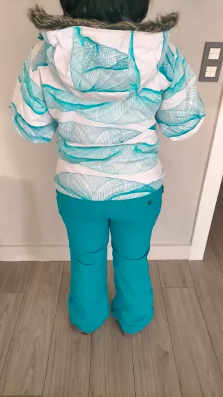 Conjunto de esquí compuesto por chaqueta y pantalón. - Chaqueta con estampado de líneas azules y blancas. - Pantalón de color azul turquesa. - Ajustable en cintura, con respiración en brazos y piernas - enganche para las botas de esquiar - pantalones con forro interior - bolsillo en el brazo izquierdo para el forfait - gancho interior de bolsillo para los guantes