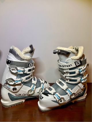 Botas de esquí Salomon para mujer en talla 23.5 (equivalente a 37 EU). Diseñadas para ofrecer comodidad y rendimiento en la montaña. - Marca: Salomon - Talla: 23.5 cm (37 EU) - Cierre con ganchos metálicos. - Interior forrado para mayor calidez.