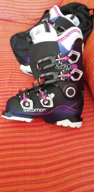 Botas de esquí de la marca Salomon en color negro y morado. Bastante usadas pero bien conservadas. Talla s/41 Cierre con hebillas.