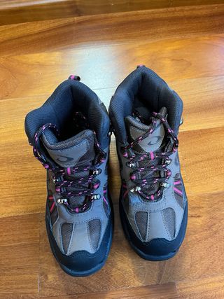 Botas de trekking de caña media, ideales para senderismo y actividades al aire libre. - Exterior de malla y material sintético. - Cordones con ojales metálicos. - Detalle de líneas en color rosa. - Suela de goma antideslizante.