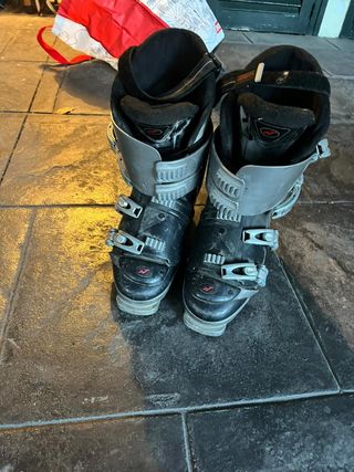 Botas de esquí usadas, en buen estado. Ideales para principiantes o esquiadores ocasionales. Nórdica marca - Marca: No especificada en la imagen. - Color: Gris y negro. - Dos pares de botas incluidas. - Se aprecian algunas marcas de uso.
