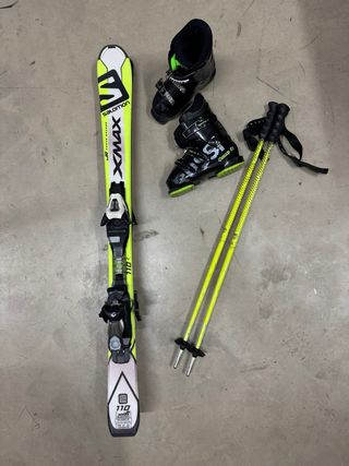 Pack completo de esquí para niños, ideal para iniciarse en este deporte. - Esquís Salomon XMAX de 110 cm. - Botas de esquí Rossignol 245mm. - Bastones de esquí amarillos.