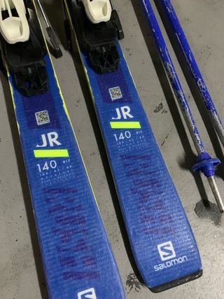 Conjunto de esquí para niños de la marca Salomon. - Esquís Salomon Rush JR de 140 cm. - Palos de esquí de 100cm - Botas de esqui marca Nordica(medidas en las fotos ) Estan bastante usados pero aún tiene.vida útil.