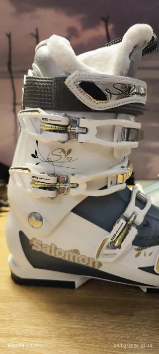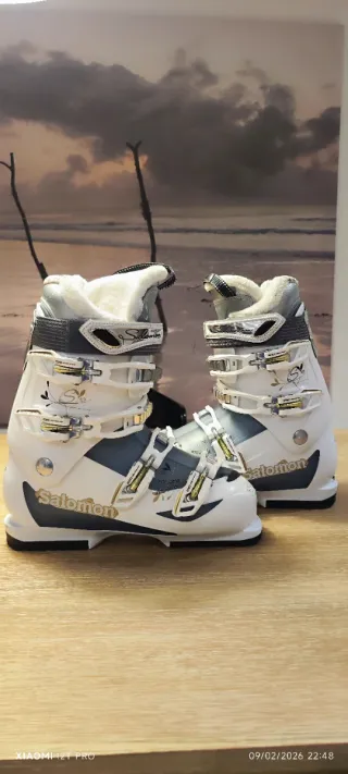 Botas de esquí Salomon (Divine Cruise) en color blanco con detalles dorados y grises. Diseñadas para ofrecer comodidad y rendimiento en la nieve. - Cierre con varias hebillas. - Interior forrado para mayor calidez. - Marca Salomon visible.