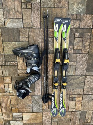 Conjunto de esquí que incluye esquís Rossignol, botas y bastones. - Esquís con fijaciones Salomon. - Bastones de esquí Rossignol. - Botas de esquí.