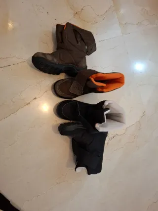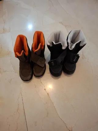 20 euros Lote de dos pares de botas de nieve para niños, en tallas 34 y 35. Perfectas para mantener los pies calientes y secos en el frío. - Un par en color marrón con forro naranja. 10 euros. - Otro par en color negro con forro blanco y gris. 15 euros