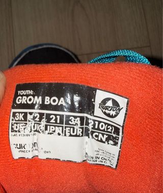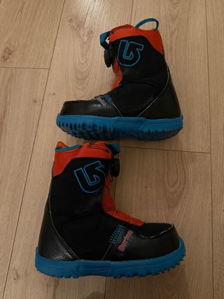 Botas de snowboard Burton Grom para niño. Comprado usado, y despues solo usado 10 dias. Hemos cambiado a Burton step on sistema. - Color negro, naranja y azul. - Cierre Boa. - Talla 34.