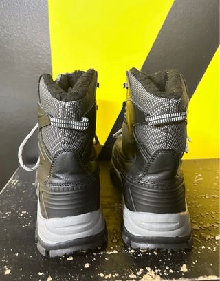 Botas de nieve para niño, talla 32. Ideales para el invierno. - Diseño moderno y deportivo. - Color negro con detalles grises. - Forro interior cálido y confortable. - Suela resistente y antideslizante. - Cierre con velcro para un ajuste fácil.