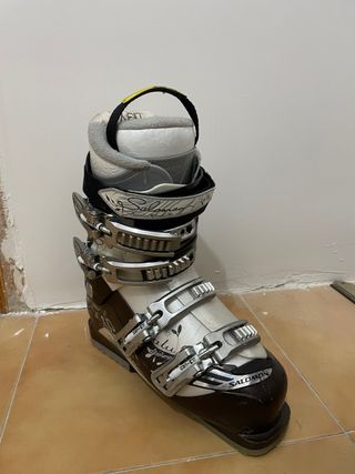 Botas de esquí Salomon para mujer. - Ideales para nivel principiante o intermedio. - Talla 24.5 (equivalente a 38-39) - Gama recreativa, cómodas y fáciles de calzar. - 4 ganchos + strap superior. - Diseño en color blanco y marrón. - Cierres de hebilla metálica. En buen estado.