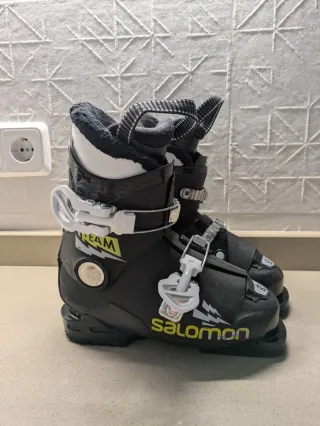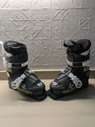 Botas de esquí Salomon en talla 18-19 corresponde a un 29-30 de calzado. - Color negro con detalles en amarillo. - Cierres con ganchos de aluminio - Interior forrado de pelo suave. Usadas pero en buen estado.