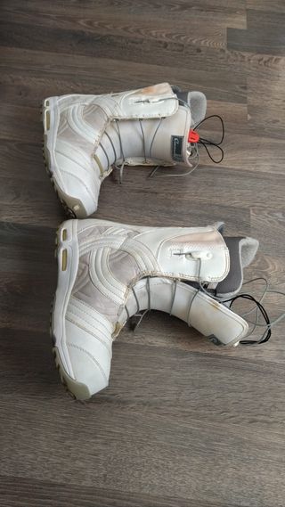 Botas de snowboard Burton Emerald, diseñadas para mujer, cómodas y con gran respuesta para toda la montaña. Ofrecen buen soporte, ajuste confortable y facilidad de uso tanto para principiantes como riders más experimentadas. Características principales: Talla 40 EUR (equivale aprox. a 7.5–8 US mujer). Ajuste cómodo con gran sujeción para el tobillo. Suela con buena tracción para caminar con facilidad. Perfectas para sesiones largas sin fatiga. Estado: usadas, tiene algunas marcas de roce por los cierres. En buen estado general y listas para seguir dando caña en la nieve