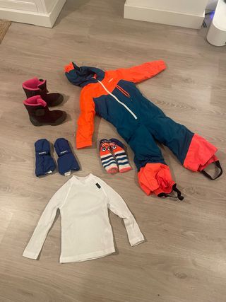 Conjunto de ropa para esquiar, ideal para los más pequeños. Incluye varias prendas para mantenerlos abrigados y protegidos. - Mono de esquí de dos colores (naranja y azul). - Botas de invierno forradas. - Manoplas azules. - Calcetines de esquí con diseño. - Camiseta térmica de manga larga. Varias prendas para esquí de niño/a valido para edad entre 3-5 años. Calcetines para un poco más pequeños. En las fotos se ven las tallas exactas