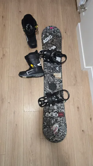 Conjunto de tabla de snowboard y botas. - Tabla de snowboard con diseño gráfico. - Fijaciones de snowboard incluidas. - Botas de snowboard marca Burton. - Diseño de la tabla con logos de Burton y 686.