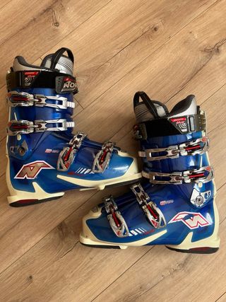 Botas de esquí Nordica Speedmachine en talla 27-27.5. - Color azul brillante. - Cierres de hebilla metálica. - Diseño deportivo.