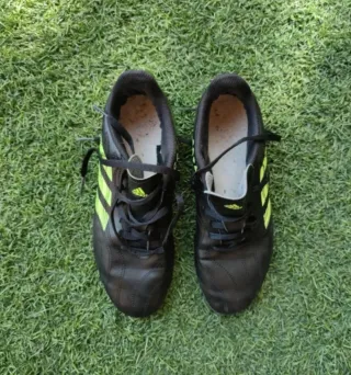 Botas de fútbol Adidas en color verde, poco usadas. - Diseño deportivo. - Cordones verdes. - Suela con tacos.