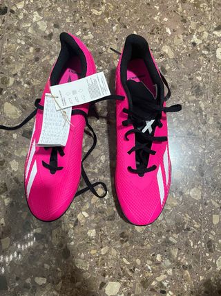 Botas de fútbol para césped artificial o natural. - Color rosa vibrante con detalles blancos. - Cierre con cordones negros. - Diseño deportivo.
