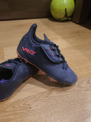 Botas de fútbol Kipsta en talla 28. Modelo viralto STC 1. Diseñadas para ofrecer comodidad y rendimiento en el campo. - Color morado con detalles naranjas - Cierre de velcro. Muy cómodo para que se las pongan los niños solos. - Con tacos para jugar en césped artificial. - Se las puso y no llegó a tocar el césped porque les estaban pequeñas.