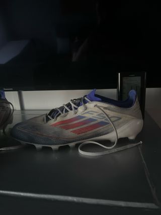 Botas de fútbol F50 con un diseño llamativo en blanco, azul y rojo. - Cordones blancos. - Detalle de líneas rojas y azules. - Interior azul. TALLA 43 1/2