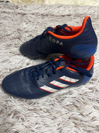 Botas de fútbol Adidas Copa en color azul marino con detalles naranjas y blancas talla 46. - Diseño deportivo. - Cierre con cordones. - Logo de Adidas en los laterales. - Inscripción 'COPA' en el lateral.