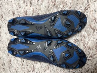 Botas de fútbol Adidas en color azul y blanco, sin estrenar. - Diseño moderno con detalles blancos. - Cordones para un ajuste seguro. - Talla visible en la etiqueta interior.