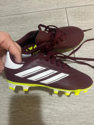 Botas de fútbol Adidas Copa Pure en color burdeos. - Diseño con tres franjas blancas. - Cierre de cordones. - Suela para césped artificial o natural. Están nuevas sin estrenar TALLA 31