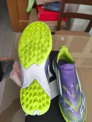 Botas de fútbol Adidas F50 con un diseño llamativo. - Color morado con detalles en verde lima. - Logo de Adidas en la suela. - Diseño sin cordones. Talla 43
