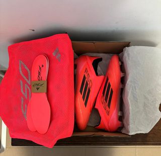 Adidas F50 Edición Mundial 2022 Num: 42,5 Ajustadas y Sin Cordones Trae su bolsa original para transportarlas Las botas están prácticamente nuevas, las he utilizado 4 veces solamente porque me van justas, al comprarlas pensé que cederían algo pero no, en la 5 foto se puede apreciar que una parte del interior esta un poco despegada, no influye en nada pero quiero avisarlo. Abstenerse ofertas absurdas porfavor.