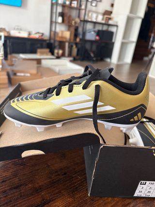 Botas de fútbol Adidas doradas, talla 35, sin usar. - Color dorado y negro. - Diseño con las tres franjas blancas. - Cierre con cordones negros. - Suela con tacos para césped artificial o natural.