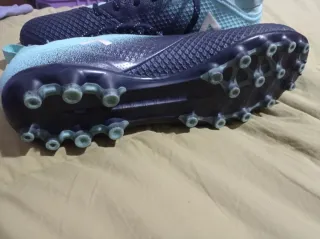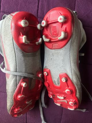 Botas de fútbol multitaco tipo calcetín unisex de Nike. Válidas para todo tipo de terrenos. Las botas están lavadas y limpias, pero si quieres dejarlas más aparentes, te tocará frotar con algún producto. Cómo se puede ver en la suela, tienen muy poco uso, por lo que no hay desgaste. A mi peque se le han quedado pequeñas.