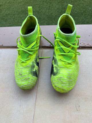 Botas de fútbol Puma para niño/a en talla 34. - Diseño alto tipo calcetín. - Combinación de colores naranja y negro. - Tacos para césped. - Manchas del uso en el campo. No salen