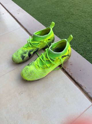 Botas de fútbol Puma para niño en color verde neón. - Diseño de calcetín - Cierre con cordones. - Suela para césped artificial o natural.