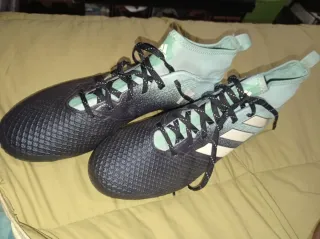 Botas de fútbol de la marca Adidas en talla 46. Diseñadas para ofrecer un buen rendimiento en el campo. - Color negro con detalles en verde menta. - Cierre con cordones negros. - Diseño tipo calcetín para un ajuste cómodo.