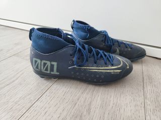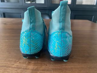 Botas de fútbol multitaco tipo calcetín unisex de Nike. Válidas para todo tipo de terrenos. Las botas están lavadas y limpias, pero si quieres dejarlas más aparentes, te tocará frotar con algún producto. Cómo se puede ver en la suela, tienen muy poco uso, por lo que no hay desgaste. A mi peque se le han quedado pequeñas.
