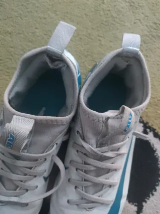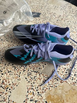 Botas de fútbol para niños y niñas con un diseño moderno y llamativo. Tienen un solo uso (le quedan grandes) - Color azul y gris. - Cierre con cordones. - Suela con tacos para césped. - Logo en la lengüeta.
